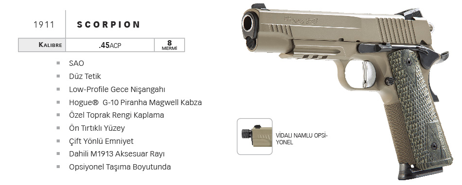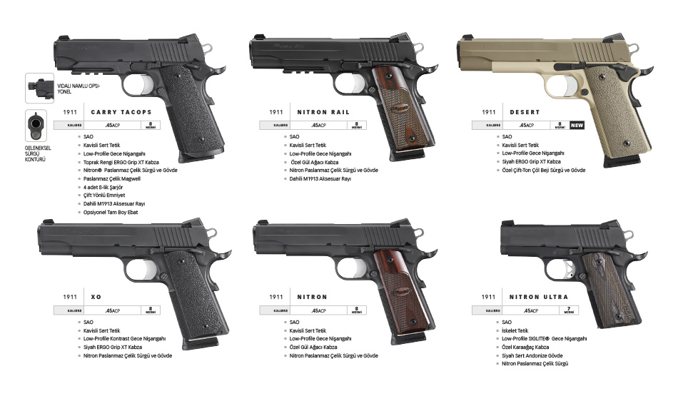 Efsanevi klasik SIG SAUER® 1911 model özel kullanıcıları ve elit taktik birimleriçin yenide dizayn edildi. Kuvvetli atış gücü, eşsiz atış keskinliği ve kıyaslanmaz dayanıklılığı ile kullanıcılarına farklı bir haz vermektedir.