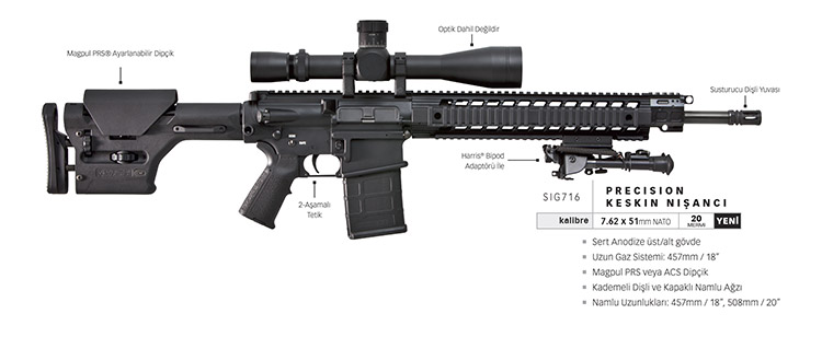 SIG SAUER’in geliştirdiği SIG716 modelinin yarı otomatik DMR keskin nişancı platformudur. 7.62x51 kalibreye sahip olup Sig SAUER’in sektöre kazandırdığı kısa darbeli itme mili çalışma prensibi sayesinde her türlü koşulda sorusuz olarak çalışır. 18” ve 20” namlu uzunluklarına sahiptir. Serbest hareket eden namlu teknolojisi ile keskin atış imkanı sağlar. İtme mili prensibi ile su, kum ve çamur altında sorunsuz olarak çalışır.
