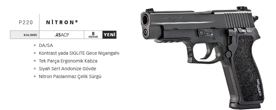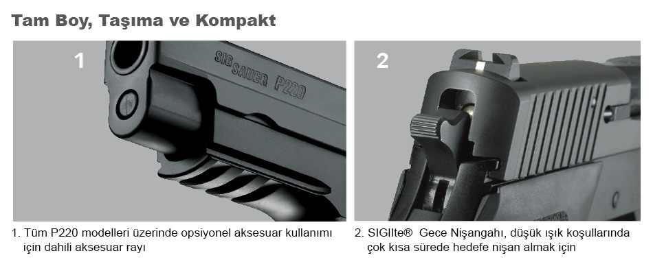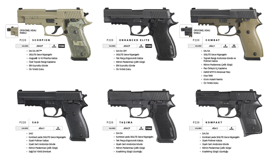 P220 tabancalar taşıması kolay .45ACP kalibre tabancalar olup mükemmel atış keskinliği ile ideal bir savunma silahıdır. Tam boy, taşıma ve kompakt gövde boyları mevcut olup, tamamı kontrolü kolay ve kullanımı kolaydır.