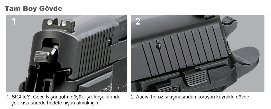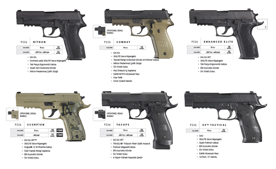Geçen uzun yıllar P226 model tabancalar kalıcılığı ve dayanıklılığı ile taarruz esnasında yan taşıma silahı olarak dünyadaki en elit askeri birimlerinin tercihi oluşu kalitesinin kanıtıdır. Atış sahası yada savaş esnasında bu yüksek kapasiteli, tam boy standart silah çağdaş birimlerin tercihidir.