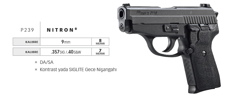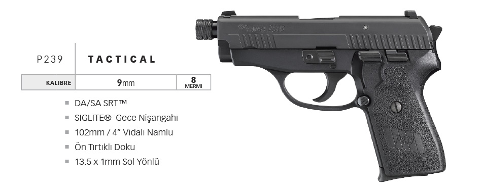 P239 tek yölü şarjör ve farklı boyut tasarımı ile tam anlamı ile bir destek ve gizli taşıma silahıdır. Bu tam metal tabanca kalibreden ödün vermeden ince bir profil sunmaktadır.